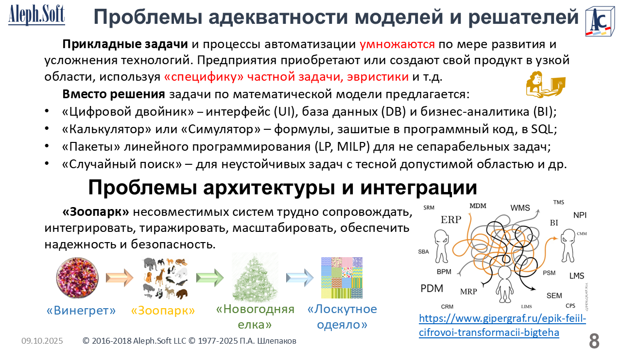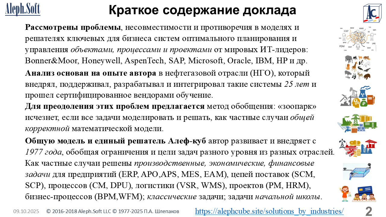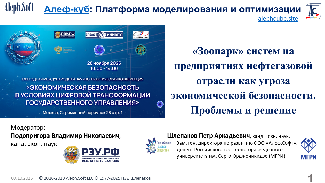 Aleph-cube 8-3-5: «Зоопарк» систем на предприятиях нефтегазовой отрасли как угроза экономической безопасности. Проблемы и решение. Ежегодная Международная научно-практическая конференция «Экономическая безопасность в условиях цифровой трансформации государственного управления». РЭУ им. Г.В. Плеханова , ФАС России, Международный научно-исследовательский институт проблем управления (МНИИПУ), 28 ноября 2025.