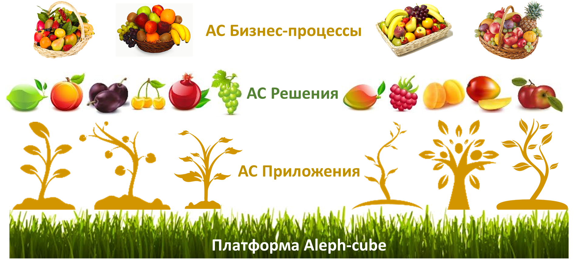 Алеф-куб содержит многомерный «куб» типовых задач, приложений, решений и бизнес процессов для разных отраслей, областей и объектов, созданных без программирования (No-Code):