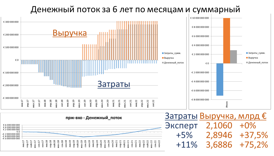 Сравниваем решения. Видим, что небольшое повышение затрат в начале проекта на 5% или 11% обеспечит лучше финансовые показатели в конце – прибыль €794 млн или €1,582 млрд.